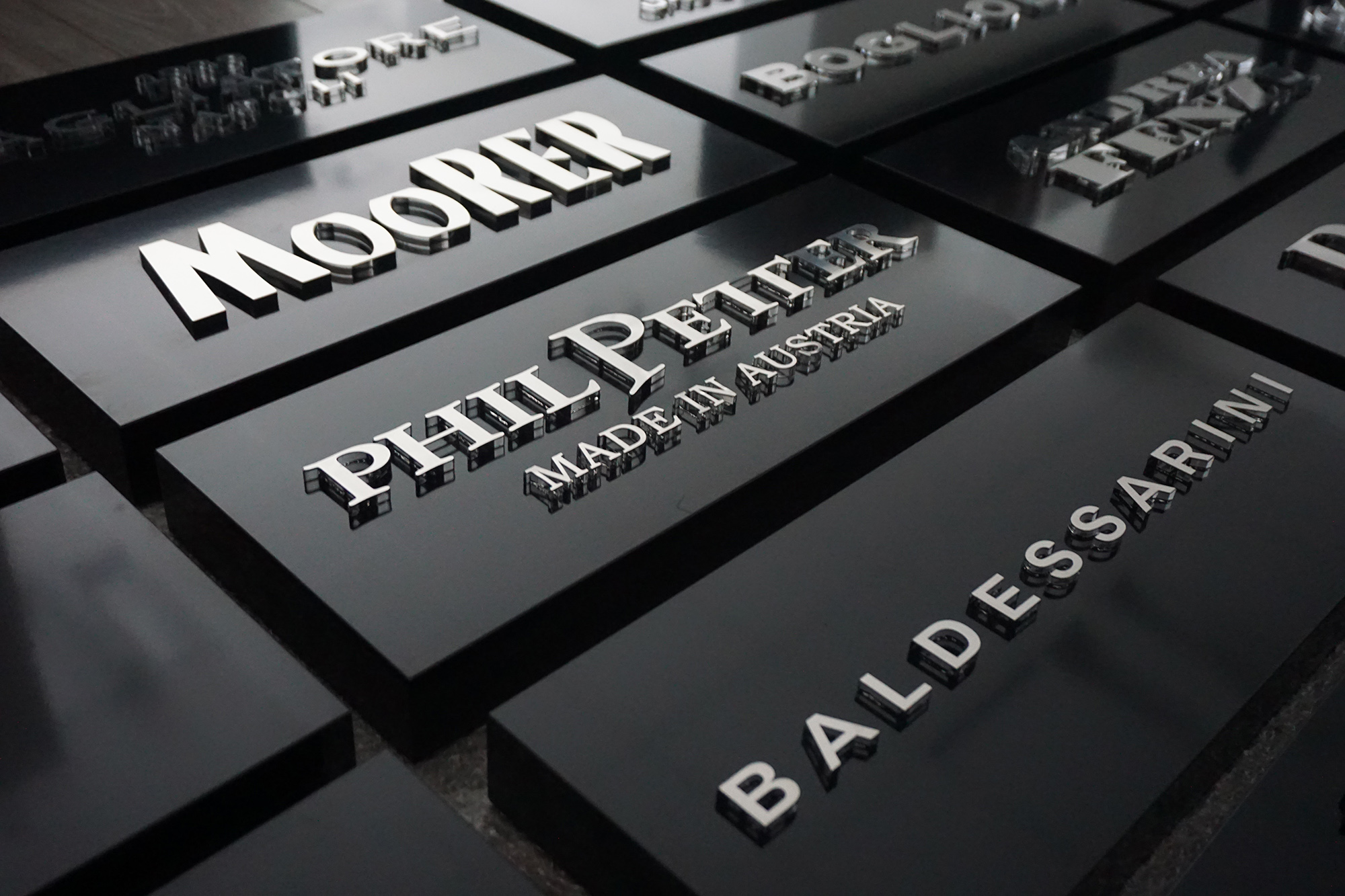 mit 3D-Schrift aus Plexiglas und Edelstahl