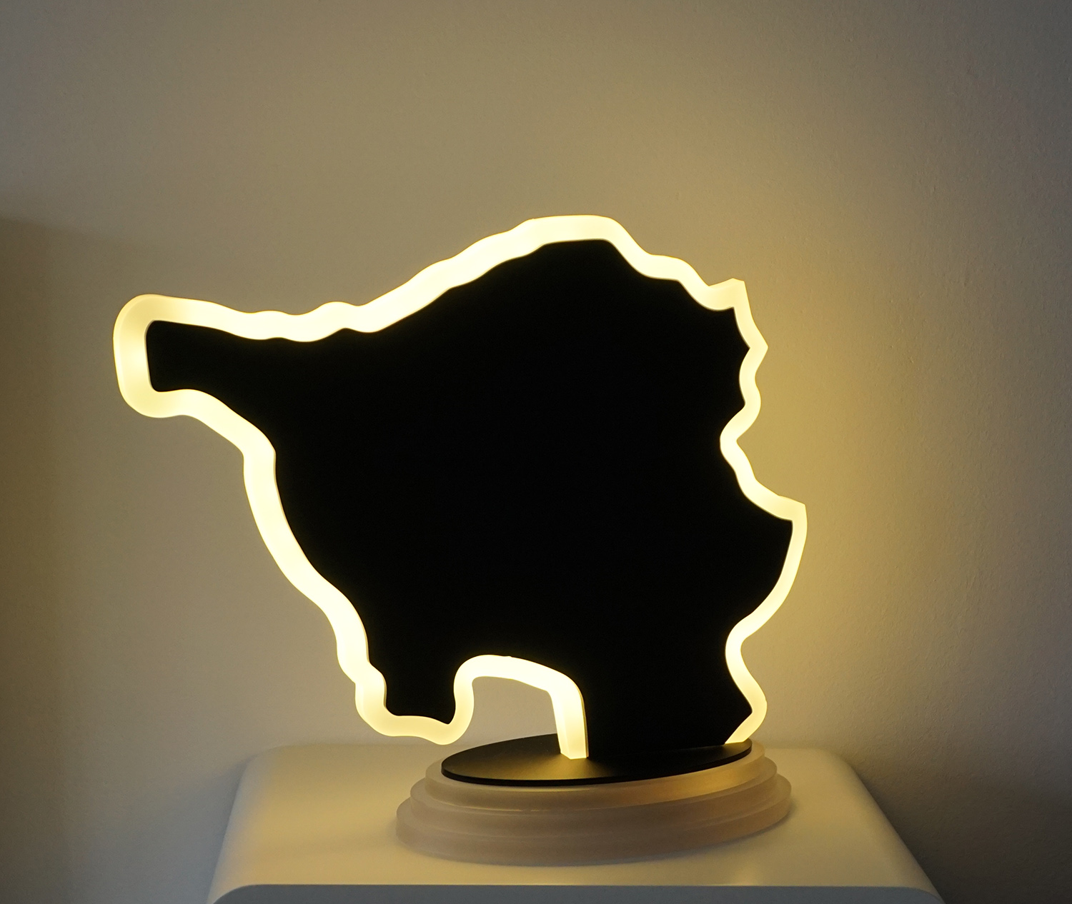 Die „Saarlamp“ ist eine originelle Leuchtskulptur aus Plexiglas in Form des Saarlandes. Dank eingebauter RGB-LED-Beleuchtung und Fernbedienung kann die Saarlamp in jeder Farbe leuchten.