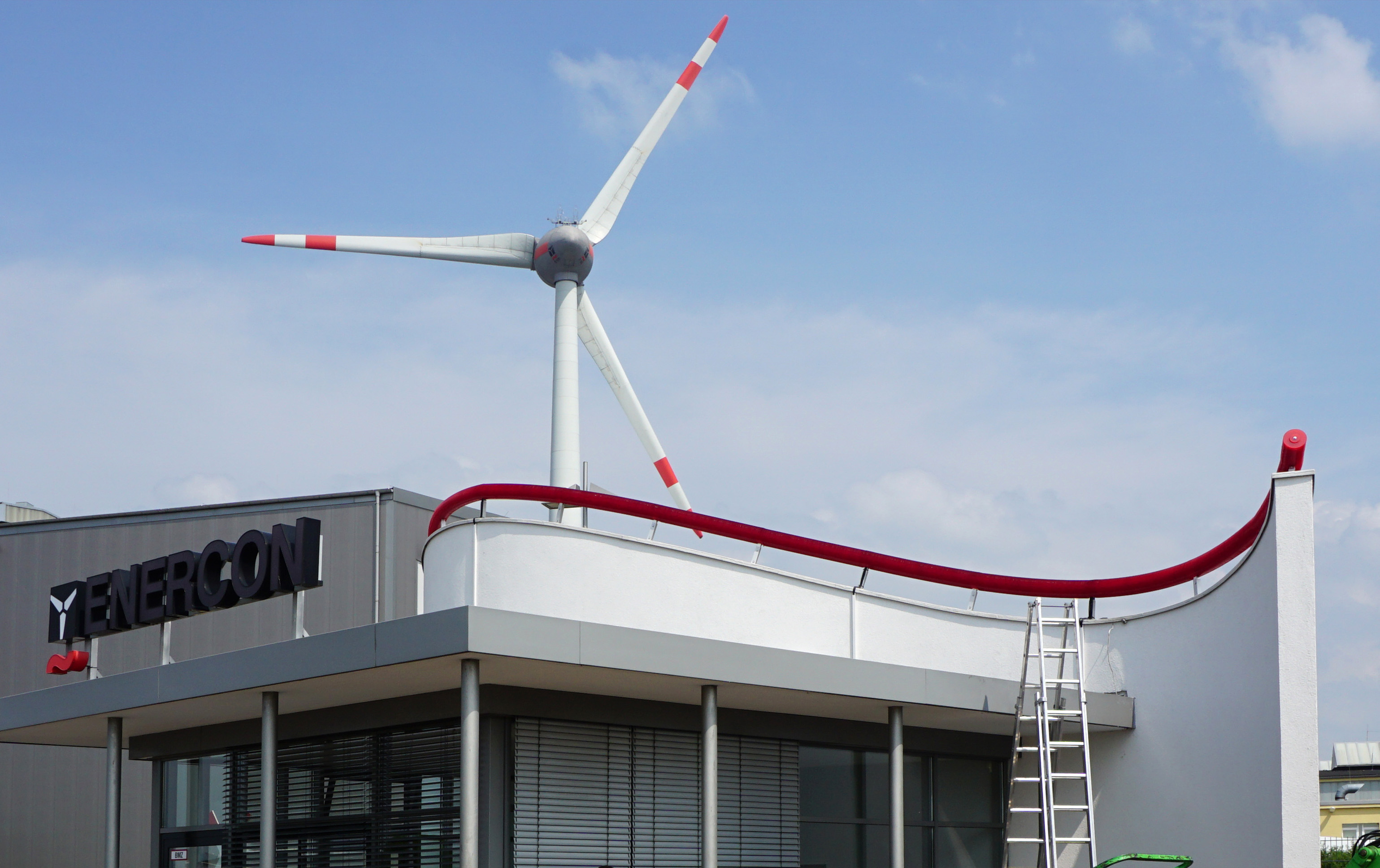 Die "„Rote Welle“ ist Bestandteil des Enercon-Logos. Über das Eingangsgebäude der Rothenseer Generatorenfertigung in Magdeburg windet sich seit 2016 diese neue,15 Meter lange Leuchtskulptur aus Plexiglas. Das Objekt besteht aus über 2000 einzelnen, roten Plexiglas-Scheiben. Die Plexiglas-Scheiben wurde von uns lasergeschnitten und auf einer dreidimensional gebogenen Rohrkonstruktion mit LED-Beleuchtung aufgefädelt.