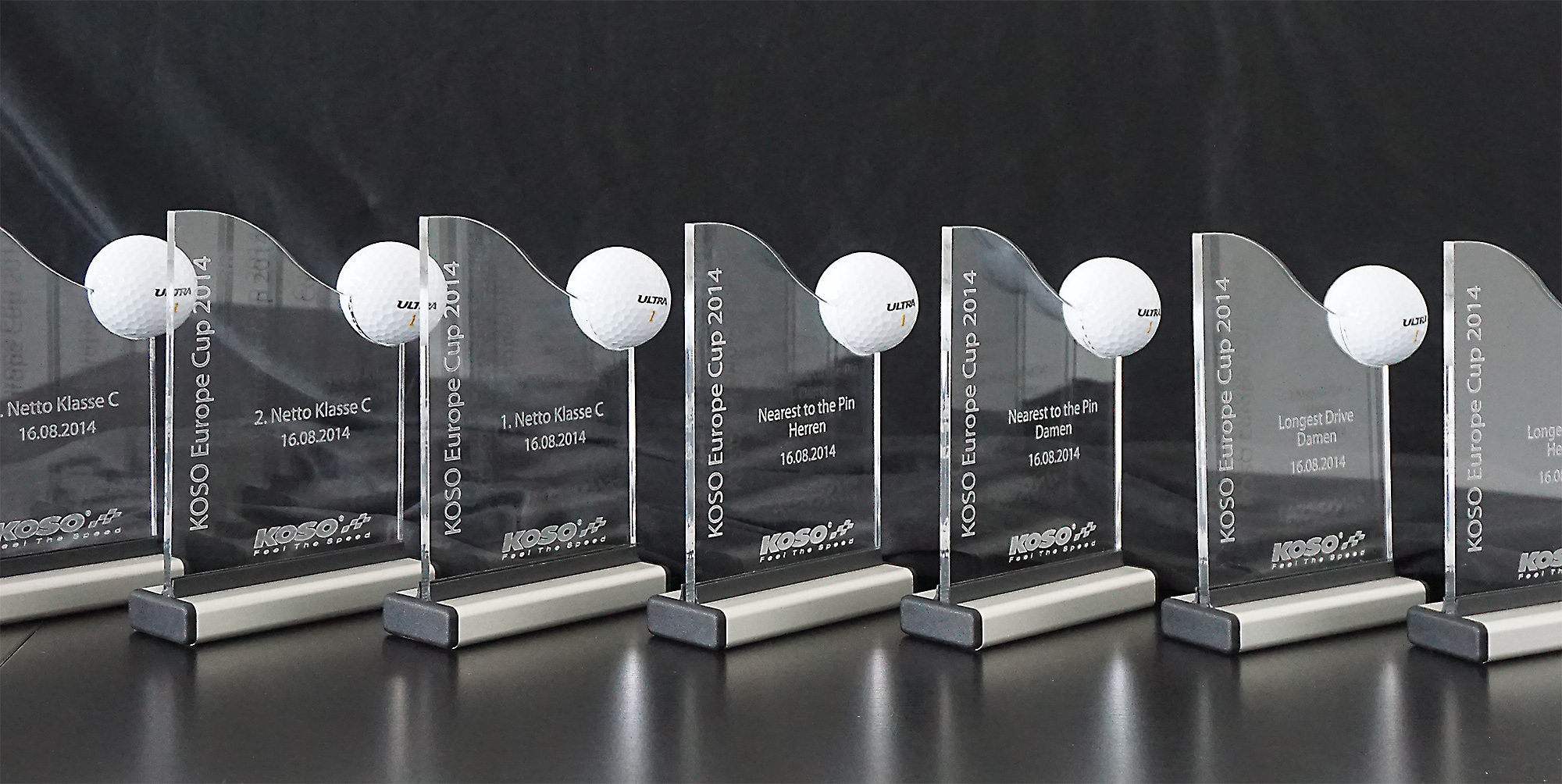 Diese Award-Serie für ein Golfturnier besteht aus Plexiglas mit Lasergravur. Im eleganten Sockel aus Aluminium ist eine LED-Beleuchtung eingebaut, die den Pokal zum Leuchten bringt.