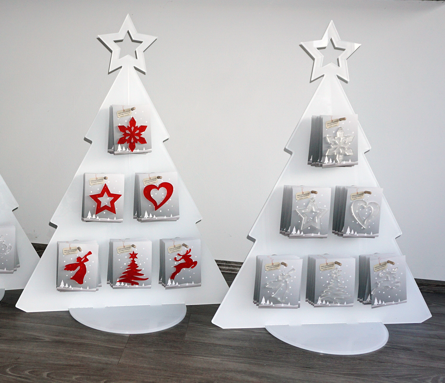 Wir produzieren modernen, formschönen Weihnachtsschmuck aus original Plexiglas für Einzelhandel und Weihnachtsmärkte. Auf Wunsch fertigen wir elegante Verkaufsdisplays dazu, wie diese Aufsteller aus weißem Plexiglas in Christbaumform.
