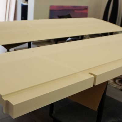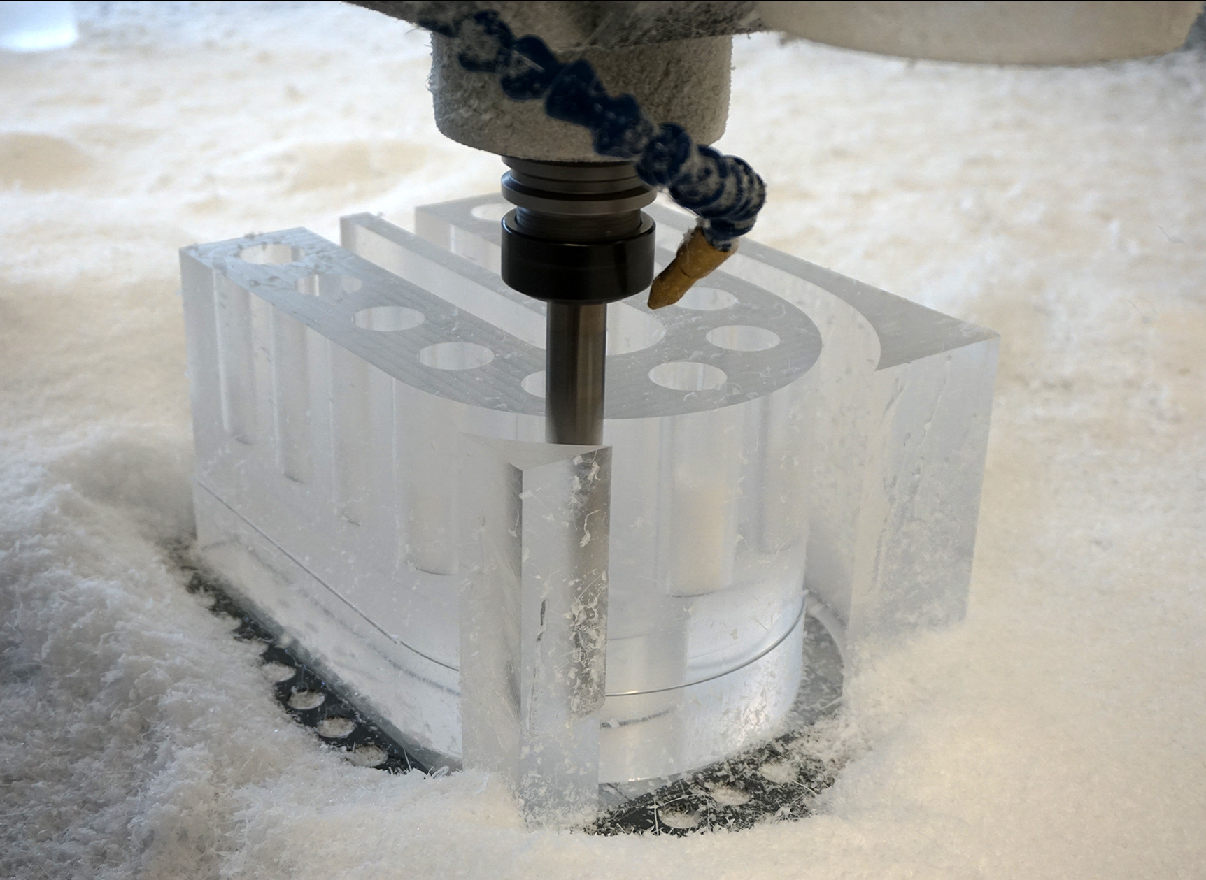 Hier wird ein 15 cm dicker Plexiglas-Block zerspant. Die Bearbeitung von Plexiglas und anderen technischen Kunststoffen ist unsere Spezialität.