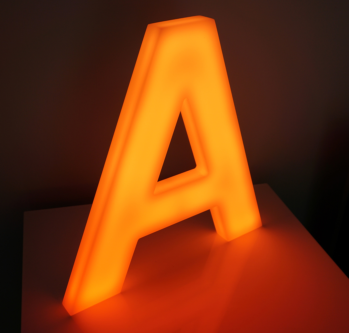 Für die Werbetechnik fräsen wir Buchstaben und Schriftzüge aller Art und Größe. Dieser Leuchtbuchstabe wurde aus massivem Plexiglas gefräst. Die darin eingebauten RGB-LEDs sind wetterfest und können in jeder Farbe leuchten.