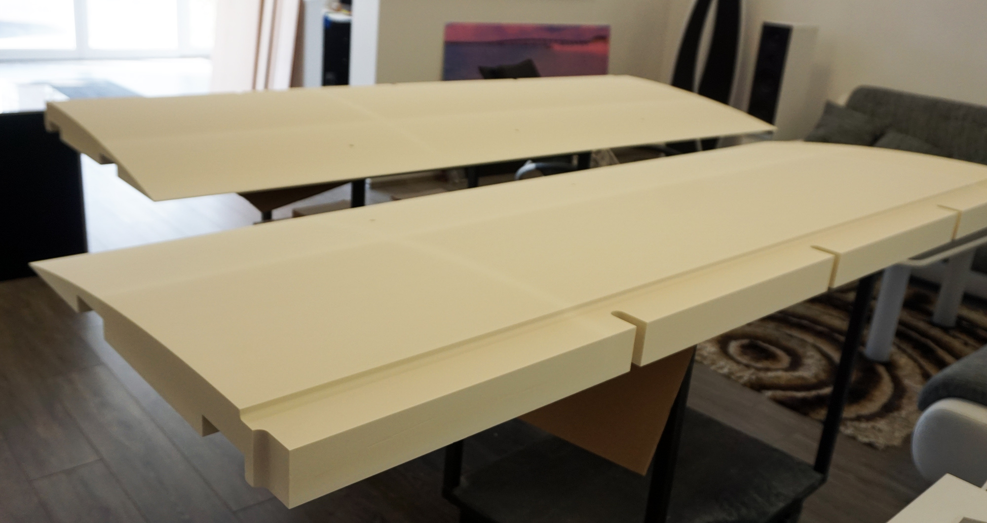 Wir fräsen für Sie auch großformatige Teile aus Kunstsoff, wie diese Sonderteile aus PU-Hartschaum für einen Windkanal-Versuchsaufbau. Wir können auf unseren Maschinen Teile bis 4x2 Meter Größe am Stück bearbeiten.