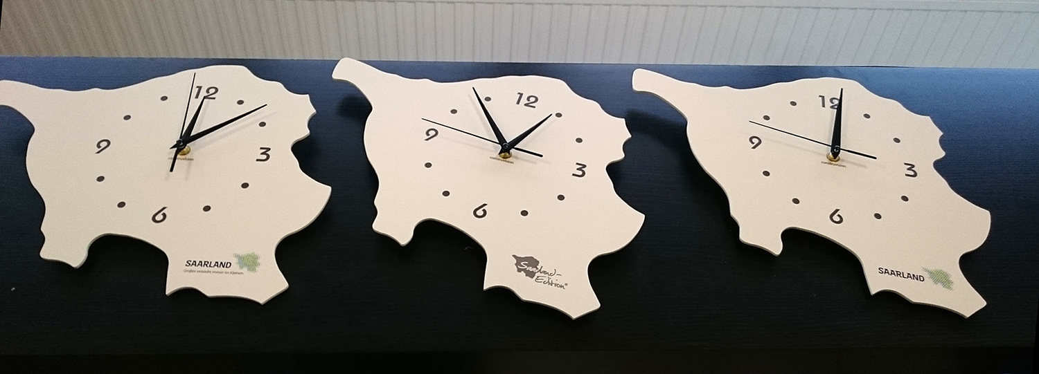 Diese Uhren in Saarland-Form bestehen aus weißem Plexiglas. Sie wurden per CNC-Laser in Form geschnitten und im UV-Direktdruckverfahren farbig bedruckt. Mit der Kombination dieser Verfahren können wir für unsere Kunden individuelle Produkte als Unikate oder in Kleinserie herstellen.