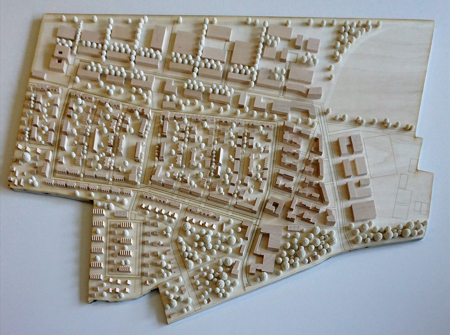 Die Gebäude auf diesem Stadtmodell sind aus Buchenholz gefertigt, die Grundplatte besteht aus Sperrholz und dient als Einsatzmodell in einem größeres Umgebungsmodell. Der Verlauf von Straßenzügen und Gebietsbegrenzungen wird hier durch lasergravierte Linien auf der Grundplatte dargestellt.