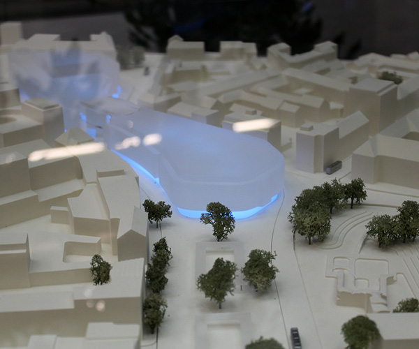 Dieses Stadtmodell der Stadt Kaiserslautern zeigt das neue Einkaufscenter von ECE in Kaiserslautern im Kontext der Stadtbeabauung. Der Gebäudekörper des Einkaufszentrums besteht aus satiniertem Plexiglas und wird von unten beleuchtet. So hebt sich die Neuplanung von der Umgebungsbebauung dezent ab. Das Modell wurde aus massivem Necuron gefräst und in weiß lackiert.