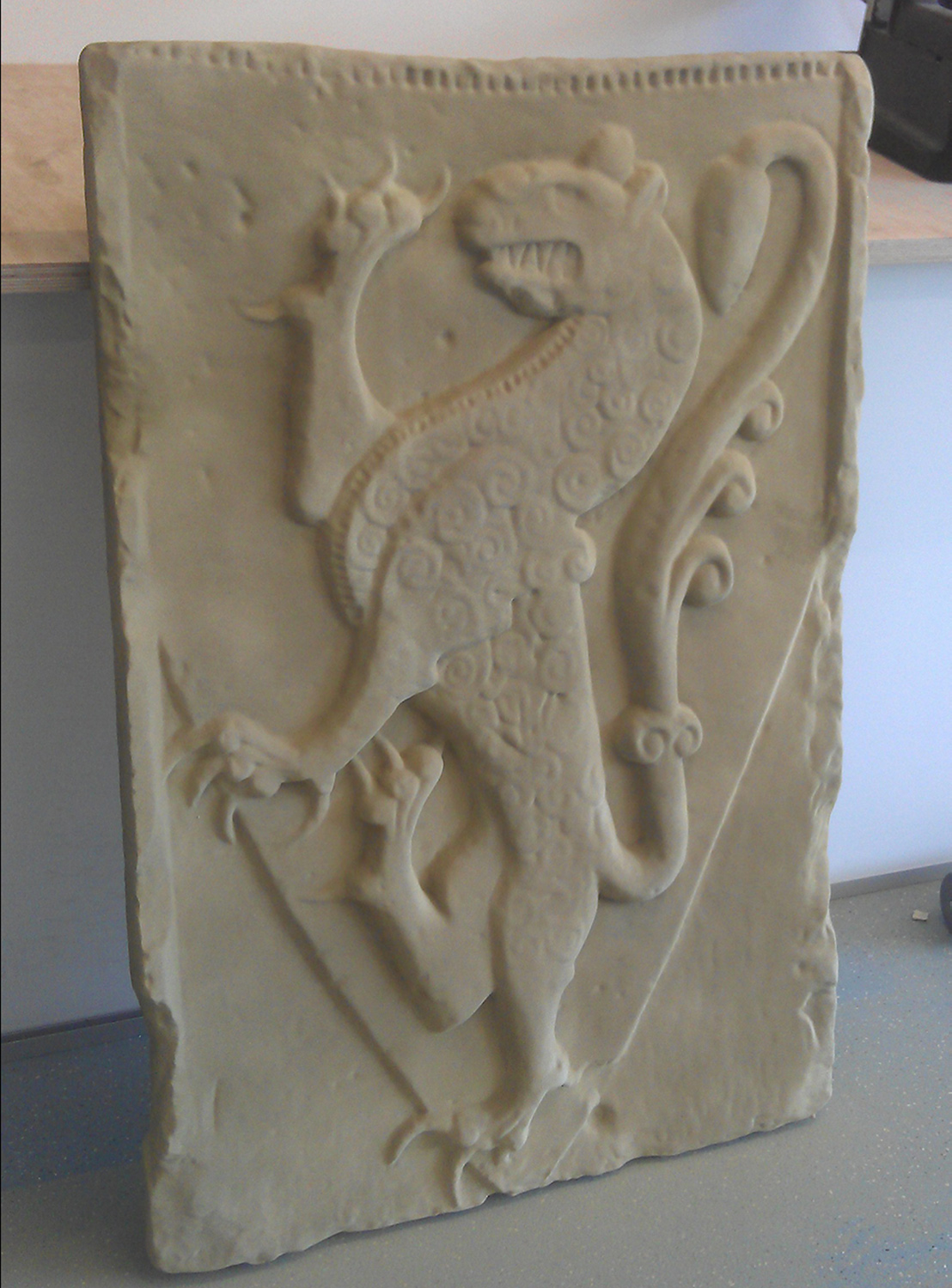 Dieser Wappenstein wurde anhand hochauflösender 3D-Scans als 1:1 Replik für Ausstellungszwecke angefertigt. Das filigran gefräste Modell besteht aus einem leichten Modellbau-Kunststoff. Es wurde speziell nachbearbeitet um eine sandsteinähnliche Oberfläche zu erhalten.