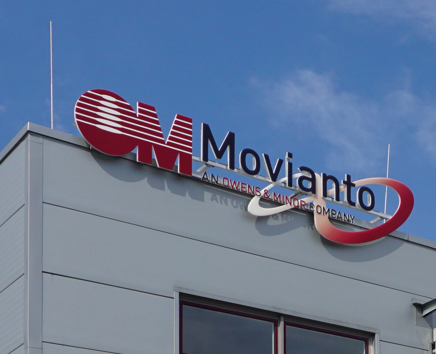 Diese über 6 Meter lange Leuchtwerbeanlage haben wir exakt nach dem Logo der Firma Movianto angefertigt. Sie besteht aus CNC-gefrästen Einzelbuchstaben aus massivem Plexiglas mit wartungsfreundlich eingebauter LED-Beleuchtung.