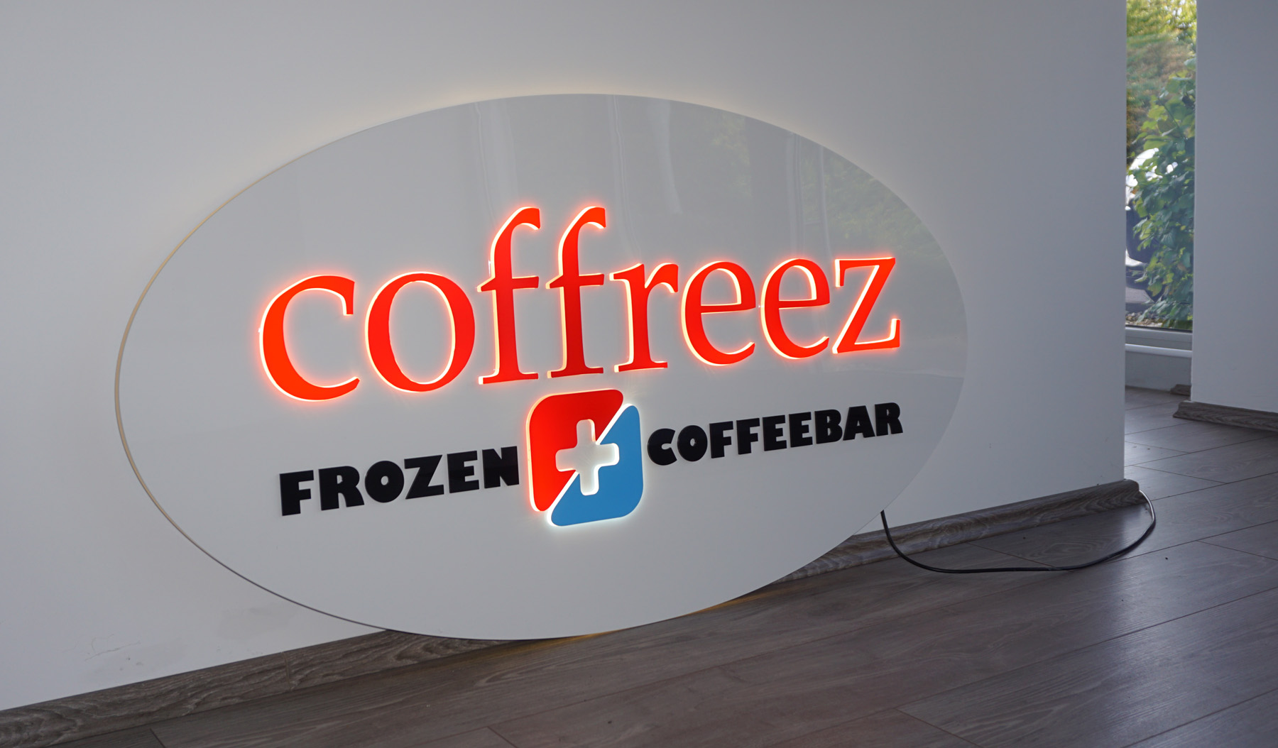 Dies ist ein ca. 140 cm großes Leuchtwerbeschild, in unserer speziellen Sandwich-Bauweise komplett aus Plexiglas gefertigt. Die erhabenen Leuchtbuchstaben wurden vorderseitig in der Farbe des Logos foliert. Der Schriftzug „Frozen Coffeebar“ besteht aus lasergeschnittenen, aufgesetzten 3D-Buchstaben aus schwarzem Plexiglas.