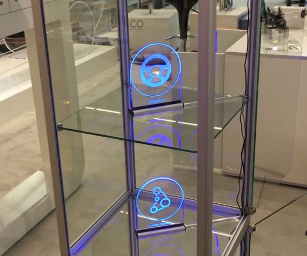 Die Plexiglas-Platte kann in fast jeder gewünschten Form ausgeschnitten werden. Als Sockel können wir Ihnen individuelle Lösungen aus Aluminium oder Holz anbieten.