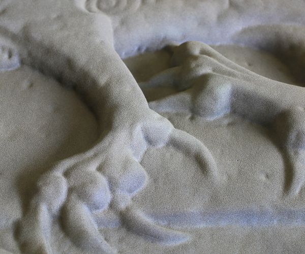 This crest stone was produced as a 1:1 replica for exhibition purposes using high-resolution 3D scans. The filigree milled model consists of a light model making plastic. It was specially reworked to achieve a sandstone-like surface.