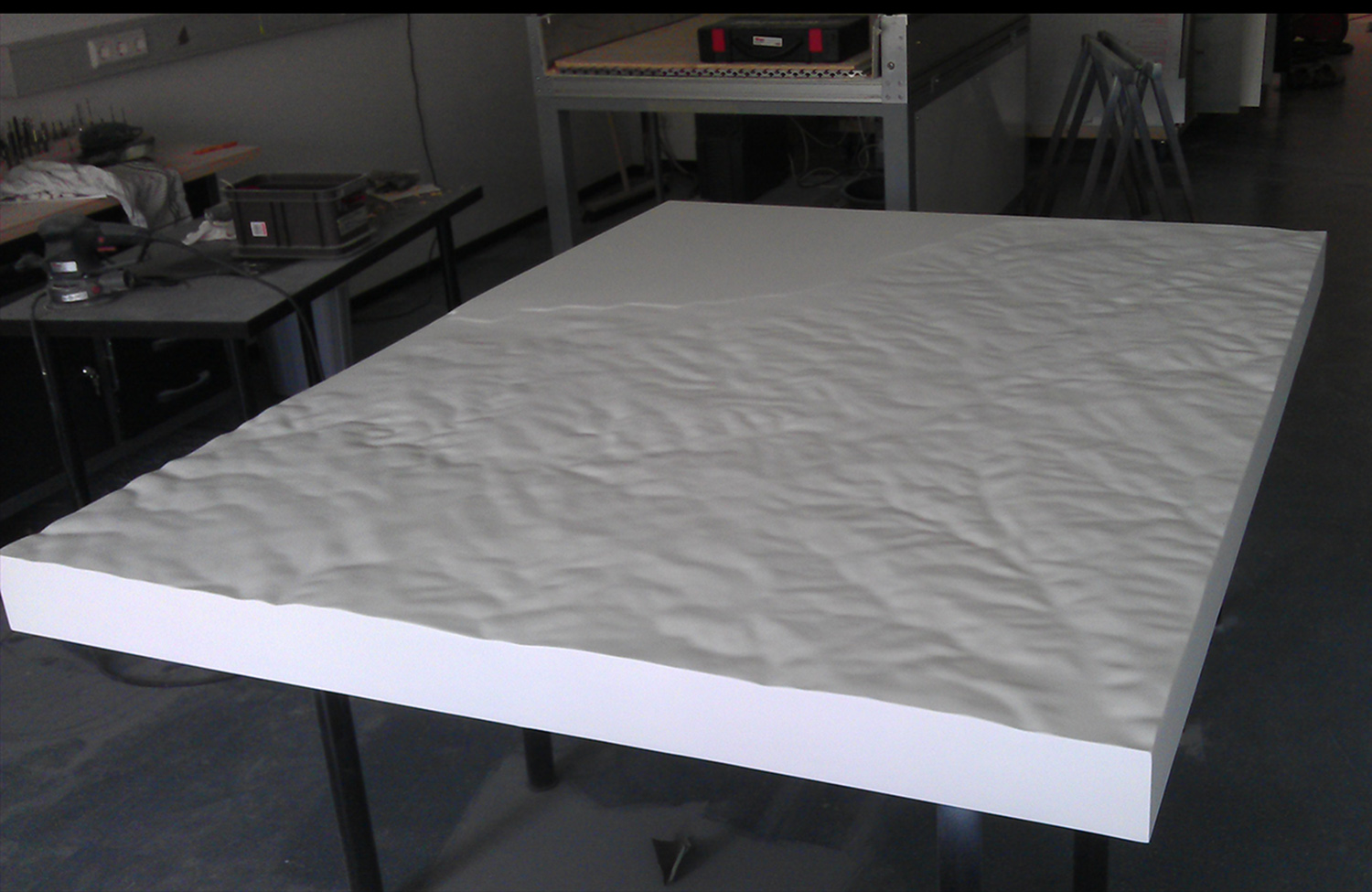 This large terrain model of approx. 2x2 meters was made for the exhibition "Wupper-Vielfalt" (Wupper Diversity). It is milled according to geodata, painted white and serves as a projection surface for a video installation.